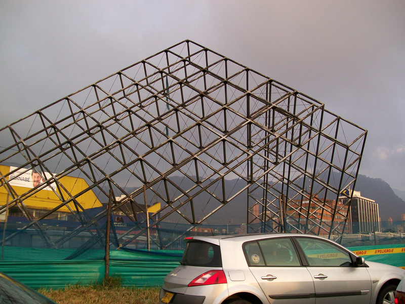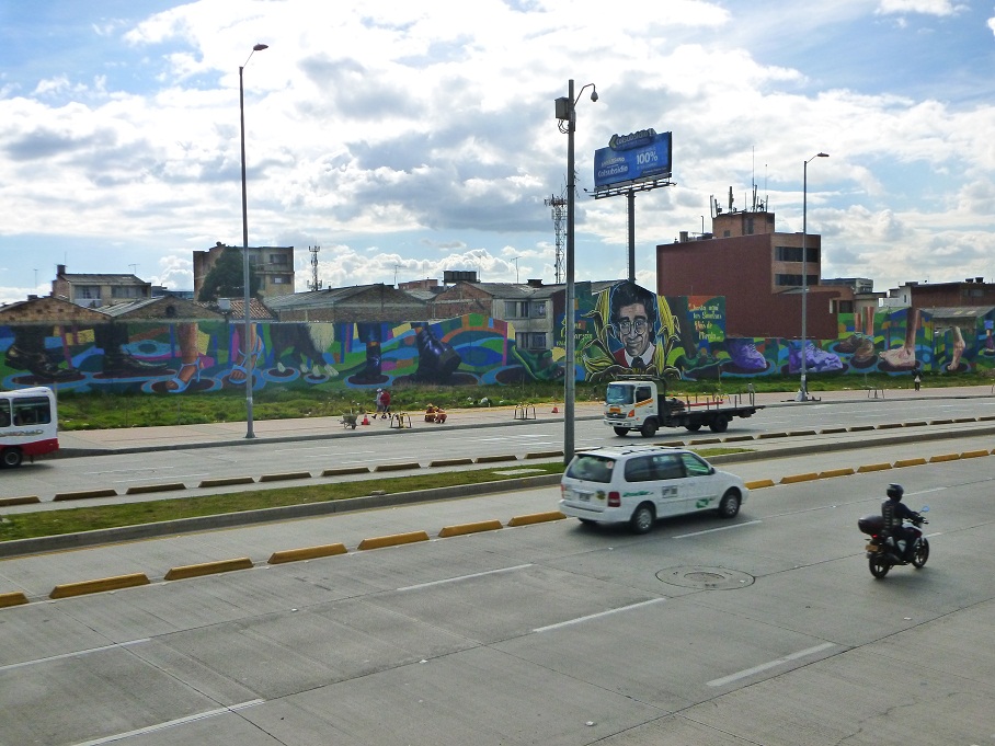 Un poco más arriba, después de la Universidad Nacional, en el cruce de esta calle con la carrera 30, se comienzan a ver en gran formato, murales que representan ideas en imágenes, rostros de mujeres y niños enmarcados en un celeste fondo que logran conjurar estados sensibles del espíritu. Hay cientos de grafitis, de firmas, de construcciones, gritos mudos, iniciales, colores alrededor. Hay cientos de voces hablando un lenguaje quieto, un lenguaje que se mueve con la pintura y no con la velocidad del impulso. Sobre esa avenida yendo hacia los cerros, aparece una escultura cinética que sirve de refugio a personas en la noche para pernoctar y un poco más adelante, un gran muro que hace parte de aquella convocatoria todo hecho de colores, aspecto abundante en estos.