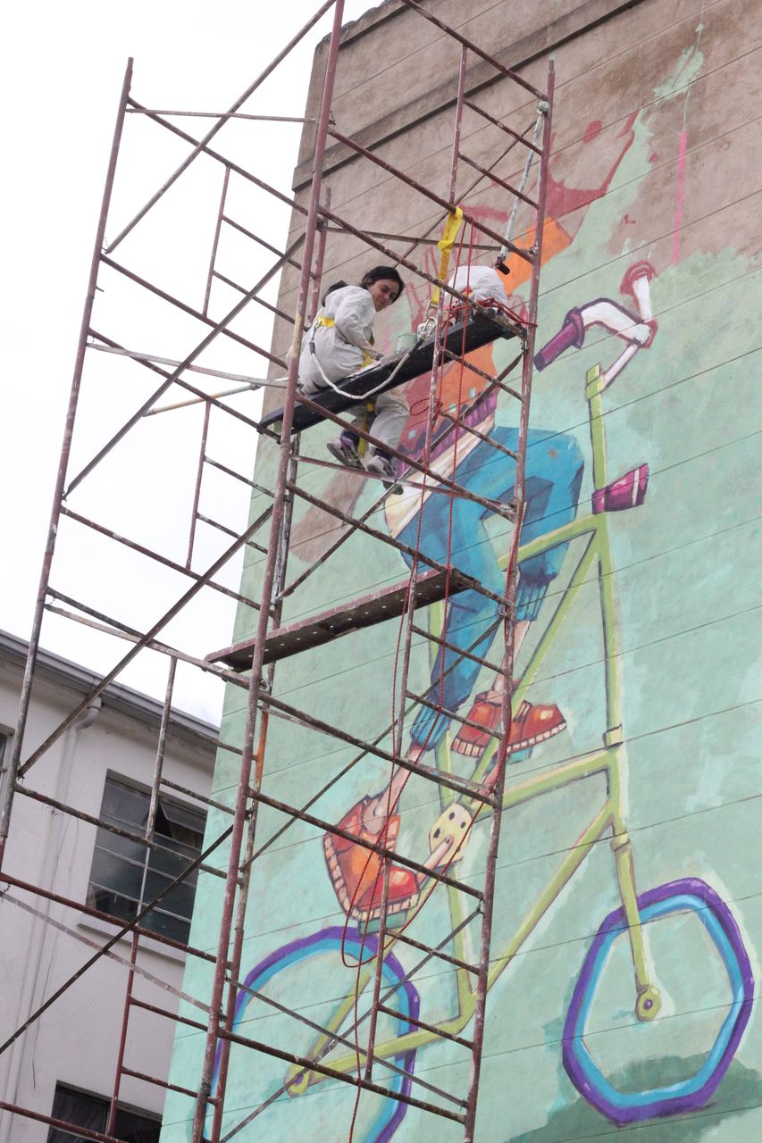 Este mural hecho con rodillo y con grúas que llevaran a los artistas más allá de muchas casas, depende de cómo se mire inaugura un recorrido que se puede como final. Esta calle es pretexto constante para articular proyectos que logren cavar una distancia entre ciudadanía y manifestaciones estéticas, en ella constantemente se reinventa la utopía de una ciudad como obra de arte o como museo al aire libre con los riesgos que esto pueda traer. Una vez la obra en la calle es puesta, es de la ciudad, de los transeúntes, de la mirada del tiempo y el vigilo de la institución. Depende de la formación de cada sujeto, de lo que se llama cultura que una obra sea o no intervenida, pero esto es prácticamente imposible en algunos lugares, es como arrojar una piedra al rio de la gran ciudad y esperar que no se moje. El concepto de duración en el arte público es algo que varía, no es una constante como en las tradicionales obras de arte, esas a las que estamos acostumbrados y creemos que todo ha de ser igual a ellas, inamovibles, intocables intachables. La ciudad en complicidad del tiempo no cesa, las manifestaciones también, en las materas, en las señales, donde sea, crece como la vida dentro de la vida de la ciudad misma día a día, en una calcomanía, con un lapicero, desafiando los preceptos y lo que esté impuesto en un orden común al que en apariencia algo debemos.
