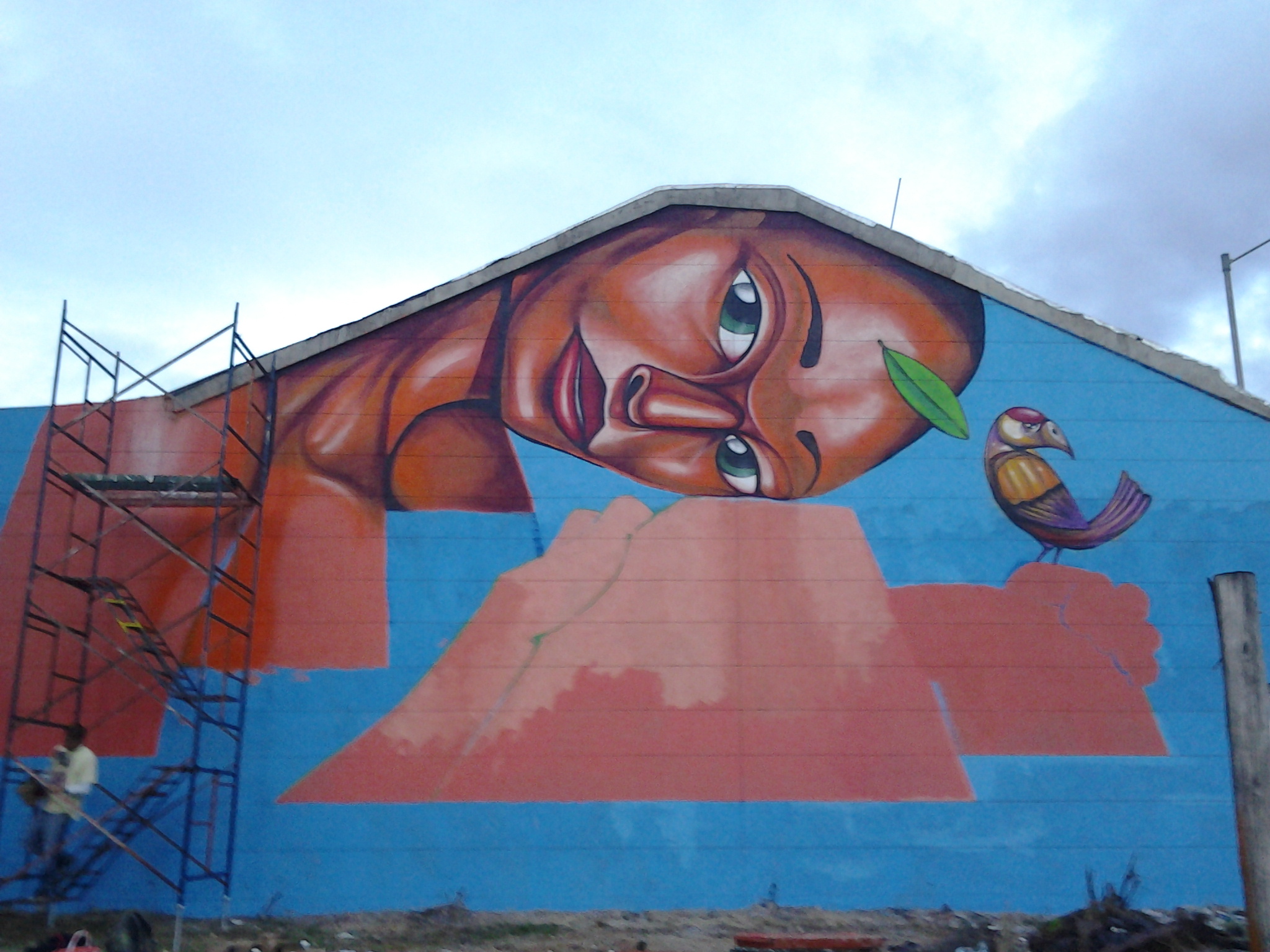 En un fondo negro, la palabra “Memoria” aparece escrita, como una señal que en la noche guía, al lado, figuras amarillas enormes se hunden y salen de la tierra junto a hormigas que flores llevan en sus tenazas, el movimiento de los cuerpos en la tierras es un renacer de aquellos instantes que enterrados se fueron y como memoria volvieron. Este mural que señala directamente un conflicto, narra historias de peligros cercanos pero que a la mirada son lejanos. El desplazamiento forzado, el huir con sus marranos y gallinas en medio de la noche, la mendicidad y el movimiento del capital que invisibilidad hablan con voz propia en este mural que todos los días deja como un recuerdo, lo que las banderas de un partido fueron en un tiempo. Un poco más adelante, frente al cementerio y la mirada de la parca que adorna su entrada, figuras de todas las formas y colores pintadas con pincel y rodillo adornan las paredes laterales de un conjunto de apartamentos acostumbrados ya a la dinámica de la calle transitada y ruidosa. Figuras que pedalean, vuelan van y vienen que revelan una plasticidad diferente.