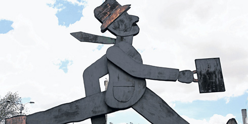 En la misma vía pero en la carrera 27, emerge un mural coronado por la figura central del único que hacia reír al decir la verdad, Jaime Garzón junto a la frase de un periodista deportivo el día del asesinato de este “Hasta aquí las sonrisas, país de mierda…” Esta intervención transformó no solo el espacio, sino la imagen que ya estaba desde tiempo antes ahí, completandola con maíz, parte fundante de la identidad de los pueblos de Latinoamérica, origen y materia prima de la cual según cosmogonías fuimos hechos. Junto a esta imagen, trabajados a rodillo y brocha en un fondo multicolor, se ven pasos que caminan, zapatos, botas, sandalias, patas de perro todos caminan, un pie delante del otro, que ya viene el de atrás a continuar la acción, que ya van, que todos vamos. Para una sociedad que privilegia la visión, estos murales deslumbran por su color, la variedad de sus técnicas, los estilos representativos y la forma como cada quien enuncia su discurso.
