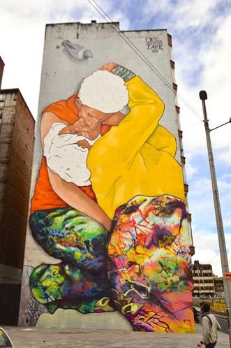 Y llegando cerca a los cerros, en una pared que mide más de 10 metros, la figura de dos personas que se besan mientras los contempla una paloma. Es curioso como una manifestación puede generar tanto enmascarado pudor, la imagen en cuestión, fue registrada por un periodista grafico en la parte marginal del centro de Bogotá mientras dos habitantes del mismo se besaban. Y que importaba si tenían los dientes cepillados o desde hace cuánto no lo hacían, esas personas se querían. ¿Quién es uno para evaluar el amor de los demás? ¿No es Dios amor? Y se levantó, por lo menos en las columnas de opinión de algunos diarios capitalinos que se distribuyen en lo que llaman provincia, una curiosa discusión sobre los actores de esta manifestación, si era de mostrar o acaso ejemplar reivindicar este gesto en personas que no tienen más que eso.