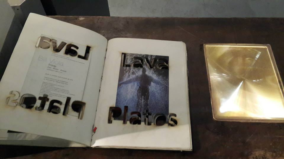 Varias de las piezas están soportadas sobre mesas que salen a medias de la pared como si más allá de esta masa de concreto se extendiera otro pedazo de sala donde está el resto de las mismas, estas que son parte de la obra sobre la cual descansan las miradas y que por sí podrían ser ya una obra, pasan tan furtivas a la observación que se confunden. Algo que no ocurre con “Árbol sabio” (2013) un escritorio donde además de acumularse el curso biológico de la existencia en una manzana que se descompone, está toda una serie de procesos tanto en el elemento, como en un libro elaborado de tiempo y recortes de algunos de los mundos del arte inglés, que en tiempos difíciles, fueron contexto del artista. Este libro, que tiene la palabra lavaplatos cortada en laser, mientras estuvo cerrado el día de la inauguración, como el libro cerrado y hermético de las pinturas de santos arcanos, no fue tocado, pero más tarde fue abierto, a partir de ahí las personas que se acercaban lo ojeaban y eran participes de la historia de un sujeto que estaba puesto ahí, a la vista de los demás para ser indagado.