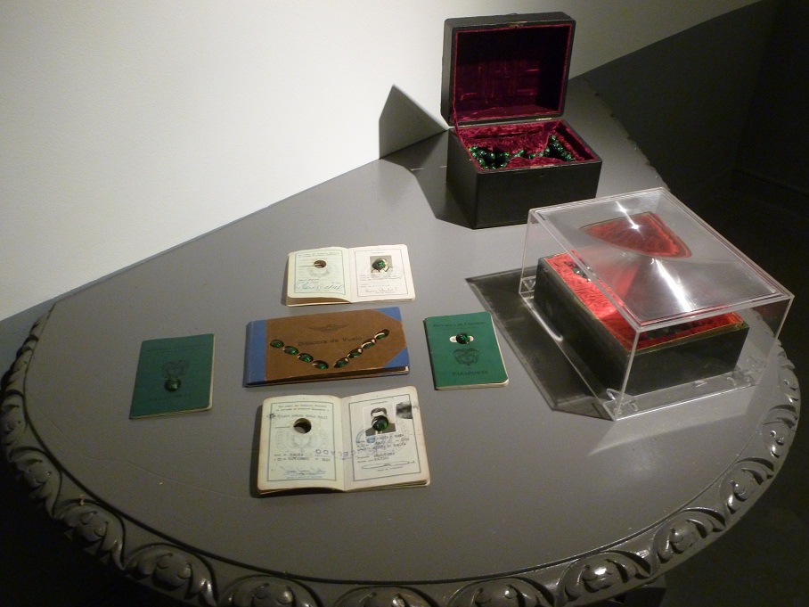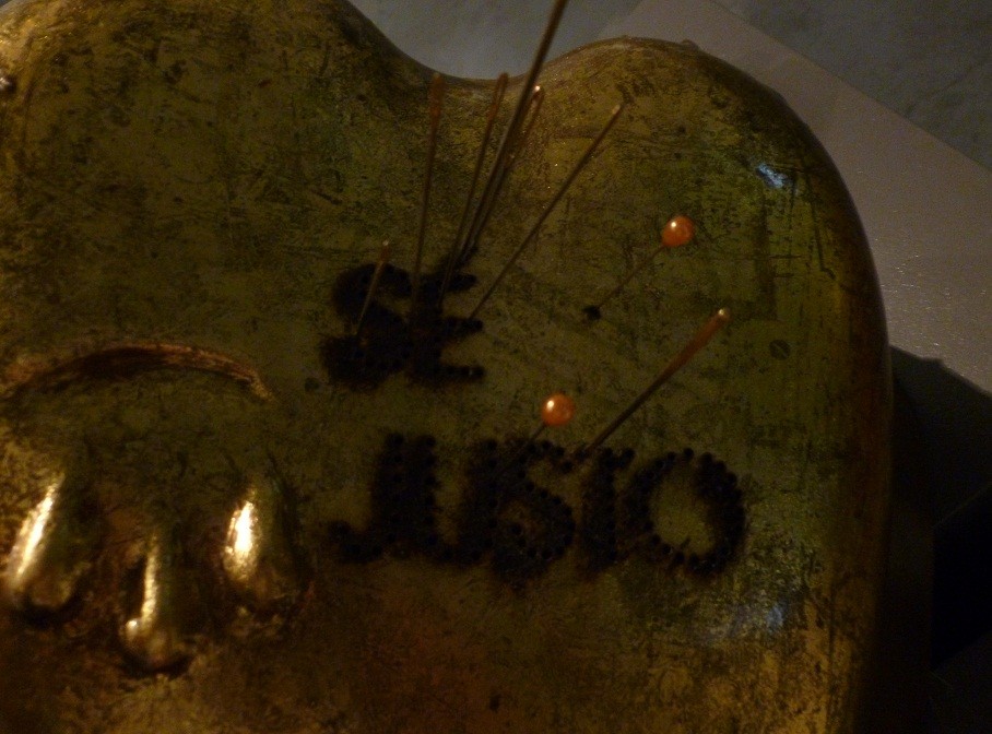 Junto a esta escultura se encuentra la única pieza con sonido, un espacio con la instalación-video “Mantra” (2008) que muestra a los escarabajos unos sobre otros produciendo un “zumbido” tan embriagador que debido a su importancia dentro de la exposición, se extrañó no sonara en todo el espacio, tal vez podría saturar después de un rato, no sé, pero como ambiente sonoro, sobrecogería por lo auditivo que acompaña lo visual. La dorada forma del sagrado corazón, metáfora del amor divino de Jesús, que hace presencia en este sagrado banquete en los tres sarcófagos; para una constitución, para un texto militar y para un general  (2013) da peso a su  contenido. En los tres, sobre terciopelo rojo referencias de poder institucional, ya sea una constitución que cada gobernante ve cómo puede cambiarla un texto militar con la inscripción JHS o un Kepis castrense atravesado por largas agujas que han formado la palabra “Se justo” que además de recordar a la maquina inquisidora de la colonia penitenciaria, rememora problemas jurídicos actuales en nuestro país, por ejemplo el del fuero militar, puesto en boga gracias a un término tan infame como “falso positivo”