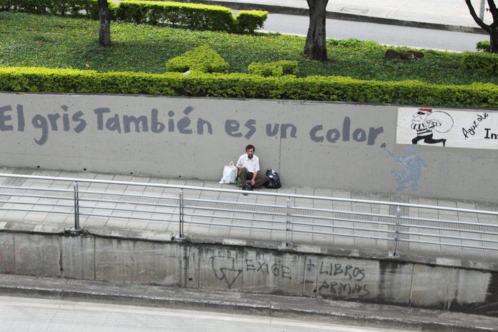 […] “¿Qué logra el alcalde encargado con esto? ¿Restaura el orden estético de los puentes con esa interesante mezcla del gris sobre gris o del café sobre gris? ¿Hace más placentero el tráfico por esa avenida? ¿Ofrece con estas intervenciones el alcalde encargado goce visual? Y es que los políticos parecen ser todos unos artistas y ésta luce como una artistada de aquellas, una gran intervención por las paredes blancas y las calles grises, como el artista Carlos Camacho en sus acciones ”el gris también es un color” pero a mayor escala. Desapareciendo los individuos solo queda la uniformidad de los paisajes urbanos, esta es la trama para establecer un simulacro del poder humano que enmascara en un color las acciones de agresión, es un discurso doble, como todos los del gobierno, ahora que hablan de paz. Pero ya fue, no hay que llorar por la pintura derramada, el transcurso del grafiti tiene sobre si ese riesgo, hoy se hace mañana no está, y a eso se somete cada artista urbano cuando toma un pedazo de la calle por fuera de una convocatoria legal, a que de un tajo se borre el trabajo hecho sin mayor pretexto. Mas todo está bien, que la noche caerá otra vez y las paredes por siempre no pueden vigilar, que la esperanza plagada de color está y aunque cien veces lo tapen, cien veces se pintará” [estonoescritica] […]