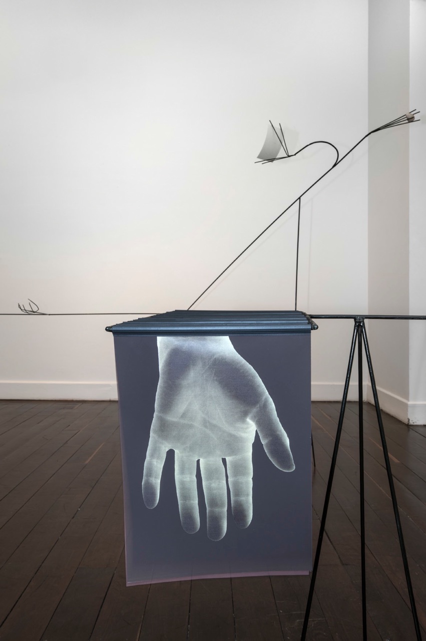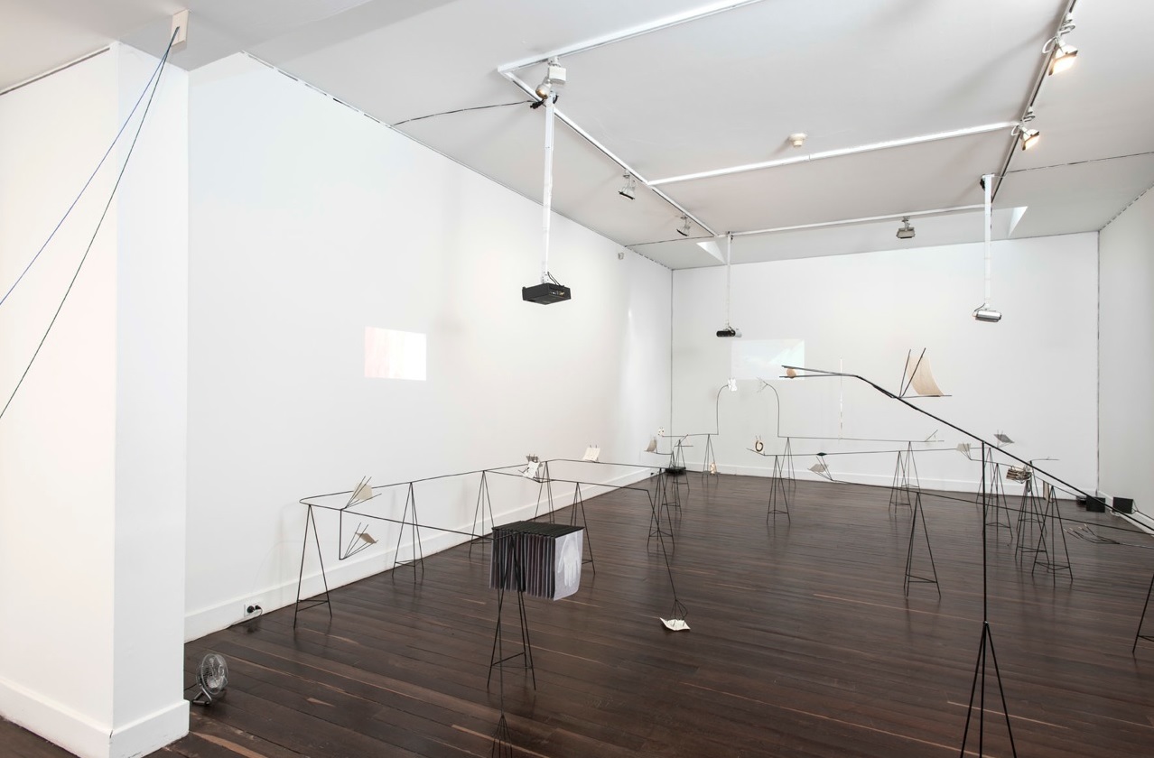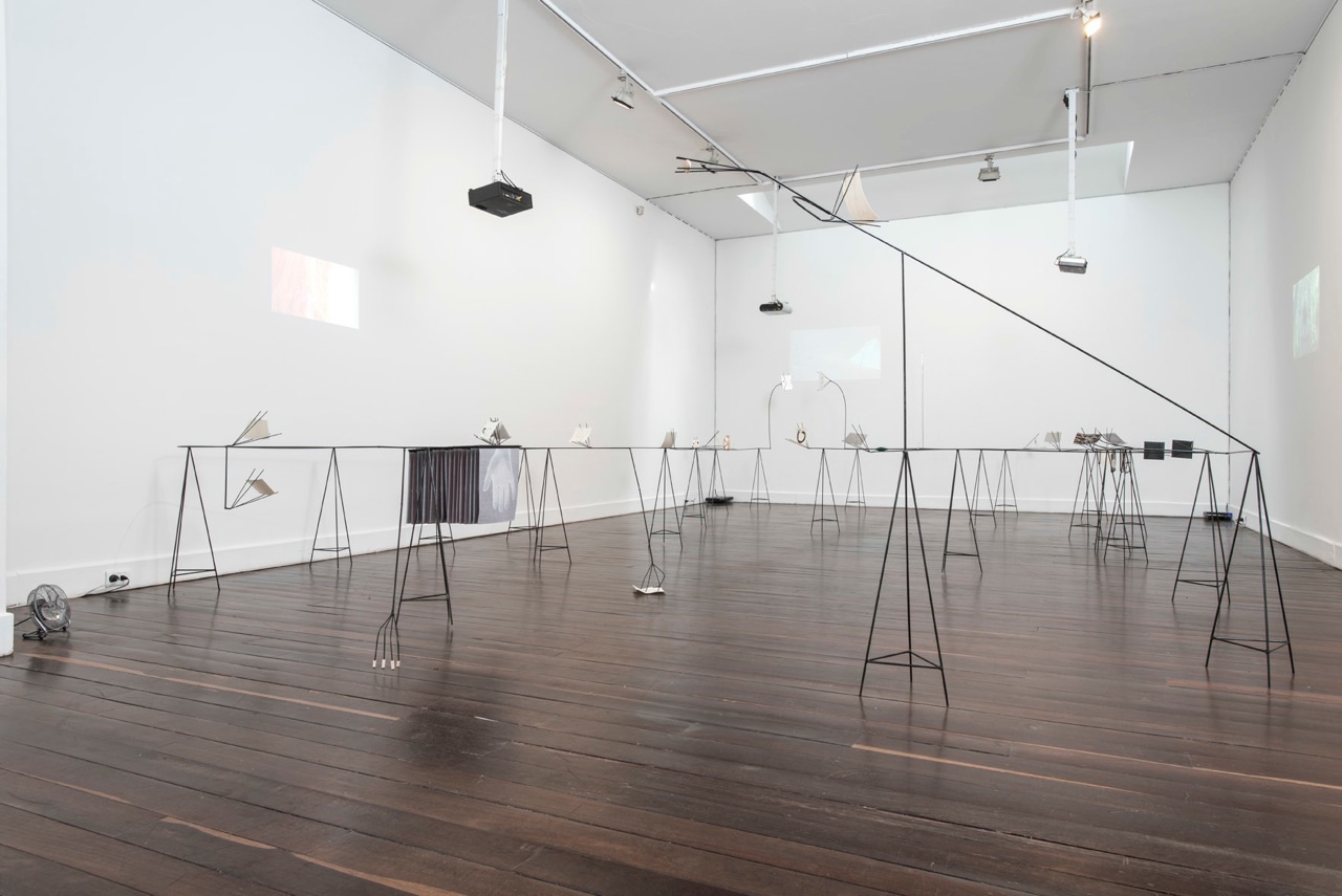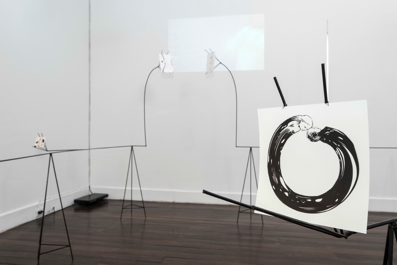 Esta instalación es una invitación a que contemplemos los objetos, nuestra relación con ellos y su entorno a la luz de la no luz, a la luz de la sombra. Objetos que se agudizan cuando la vista falta, como las personas que viven eternamente «Días enteros con los ojos cerrados» y andan por el mundo con una agudeza admirable. ¿O acaso llevamos días enteros con los ojos cerrados? ¿ciegos del sol que dora nuestros rostros, en medio de las sombras, entre la ilusión y la percepción, como si observáramos el reflejo de la idea? Y no importa la respuesta, porque Rita Ponce de León dibuja y sigue diluyendo tinta papel tras papel, en un impulso vital, incansablemente en cualquier lugar o pared, vinculando el cuerpo, la música interior y el movimiento creador.