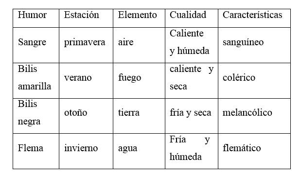 En el s. XVI fruto de una larga tradición que comienza con Hipócrates en Grecia, los seres humanos en el pensamiento occidental eramos catalogados según cuatro humores o temperamentos; una persona con exceso de bilis amarilla era irritable, orgullosa, ambiciosa y vengativa, el exceso de humor sanguíneo, que es caliente y húmedo, producía excitación, optimismo y entusiasmo en Primavera. El flemático que era frío y húmedo generaba apatía e insensibilidad en el Invierno mientras que el exceso de bilis negra en otoño convertía las personas en melancólicas, distantes, inactivas y cercanas a la locura de la soledad. La sangre caliente y húmeda, como el aire, aumentaba en primavera, la bilis amarilla, caliente y seca como el fuego en verano, la bilis negra fría y seca como la tierra, lo hacía en otoño.