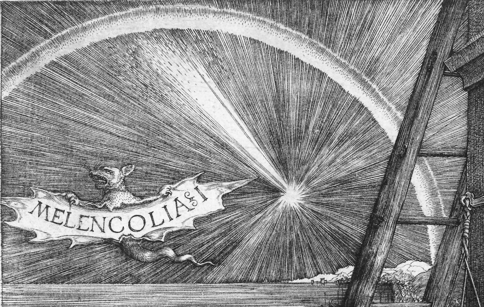 “El compás se daña por falta de ocupación, la escuadra y el martillo significan la geometría empleada con propósitos astronómicos o metereológicos, el poliedro representa la geometría descriptiva”[3], pues aquí como en muchas otras representaciones contemporáneas es a la vez un problema y un símbolo de la óptica definida junto a instrumentos para medir el tiempo y el peso: la balanza, el reloj de arena y la campana.