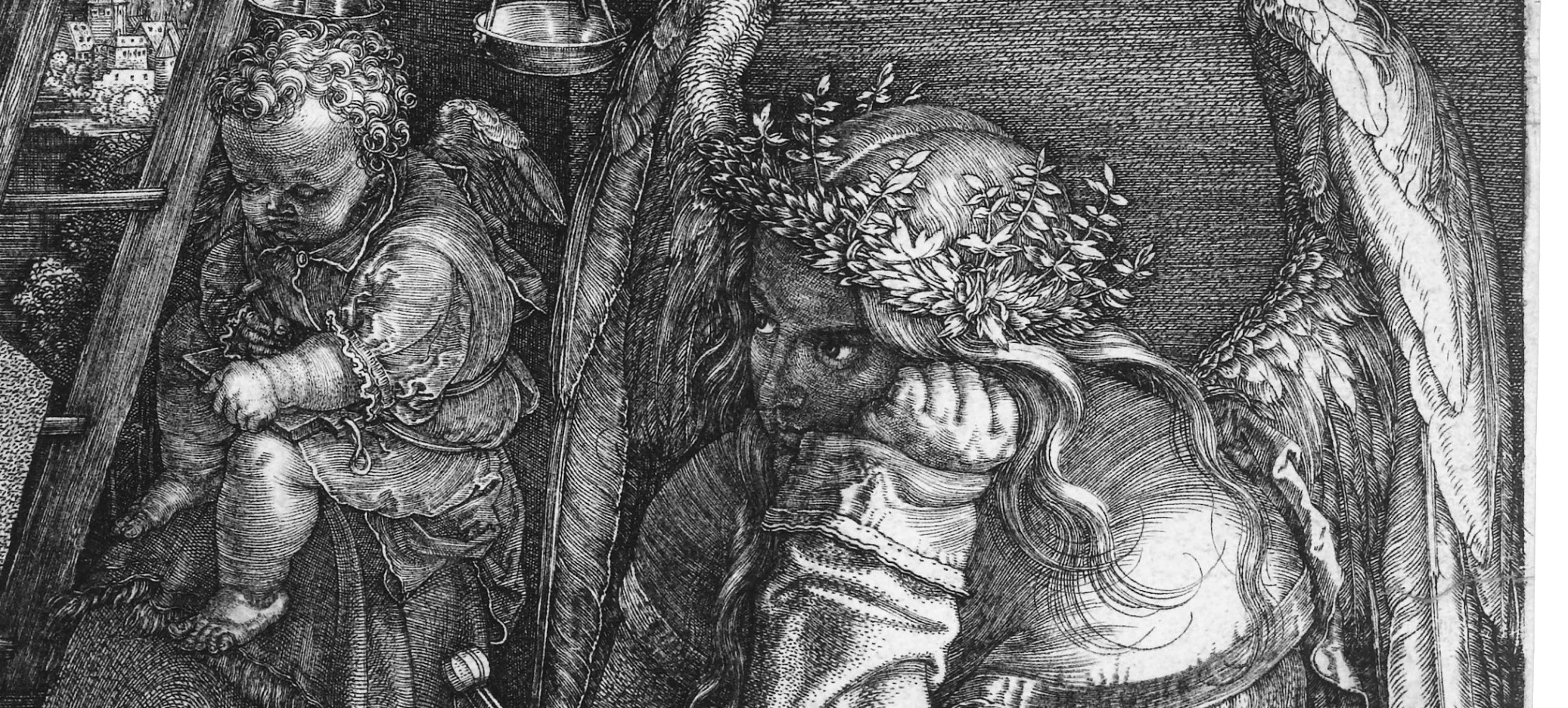 Entre los primeros elementos que resaltan en el grabado Melancolía I está la figura del ángel con la mano cerrada sosteniendo su cabeza, pensativo, lejano y distante. El gesto del puño cerrado que hasta aquí era un mero síntoma de enfermedad, ahora simboliza la concentración fanática de una mente que ha visto verdaderamente un problema pero que al mismo tiempo, se siente tan incapaz de resolverlo como de desecharlo. El puño cerrado cuenta la misma historia que la mirada vuelta a una lejanía vacía, a diferencia de la mirada gacha que antes se atribuía al melancólico, los ojos de la melancolía miran al reino de lo invisible con la misma vana intensidad con que su mano ase lo impalpable.