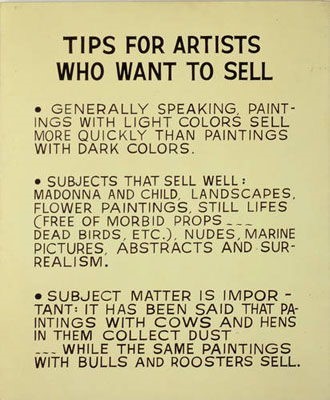En 1966, con ‘Tips For Artists Who Want To Sell’ puso afuera del salón donde daba clases de arte, una suerte de checklists en las que anotaba qué y cómo debían hacer los artistas sus pinturas, para que fuesen más fáciles de vender; de esa manera, hacía una crítica al mercado del arte, mientras se burlaba también de cómo se ven los manuales de arte tradicional, y lo que representa comprar ese tipo de obras, hechas exclusivamente para ser vendidas.