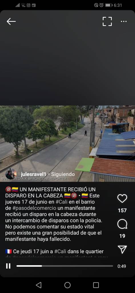 Por otro lado, para criticar la violencia, para resistirla, para desmantelarla, hay que describirla, y para esto hay que mirarla. Los videos, imágenes y envivos surgidos del Paro tenían la urgencia de llegar a la mayor cantidad de gente posible, tratar de hacer saber lo que estaba pasando incluso a quienes no querían saber. Alguna vez, la docente y artista caleña Carolina Charry escribió que eran imágenes pensadas para la preservación de la vida, antimilitares, que apelan a la democracia, escapan a la censura, crean testigos, y buscan acción política. Las imágenes se conciben como armas, como defensa, como prueba, como registro. No buscaban el heroísmo, sino la dignidad, y por su misma fuerza viral, irrumpían en el orden de la “noble mentira” que venía manejando la clase política. Esta resistencia era tal como lo dijo Didi-Huberman: