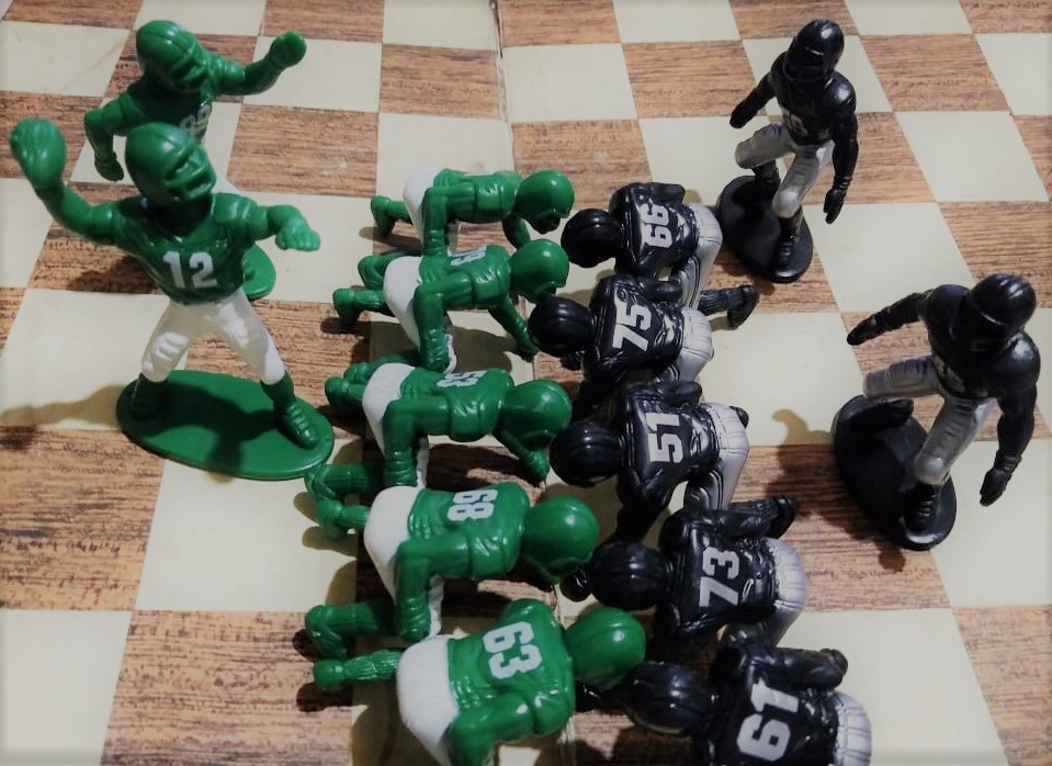 Para iniciar la comparativa, imaginemos un tablero de ajedrez con sus piezas en sus lugares respectivos, pero colocaremos un balón. Extendamos este tablero a un total de cien casillas de norte a sur, para que sea un rectángulo similar a un campo. Al lado blanco, lo denominaremos ofensiva, y al negro, defensiva. El fútbol americano consta de once jugadores por equipo, por lo que quitaremos cinco fichas blancas y nos quedaremos con seis Peones, dos Torres, un Alfil, un Caballo y la Reina. Su objetivo es llevar el balón a través de las casillas hasta la zona de anotación del contrario. Para hacerlo, disponen de cuatro oportunidades para avanzar diez casillas, si no lo logran, deben entregar el balón al equipo contrario. No importa si logran veinte o treinta, lo importante, es ir ganando terreno hasta lograr el gol.