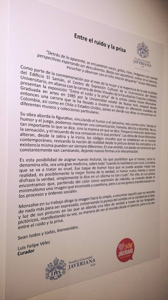 Como parte de la conmemoración por el mes de la mujer y la reapertura de la sala múltiple del Edificio El Samán, el Centro de Expresión Cultural en alianza con la carrera de Artes Visuales de la Facultad de Creación y Hábitat, presentan la exposición “Entre el ruido y la prisa” de la artista caleña Vivian Monsalve. Graduada en artes en 1985 por la Universidad estatal de Nueva York, empezó desde entonces una carrera que la ha llevado a mostrar su trabajo en diferentes ciudades de Colombia, así como en Chile o Estados Unidos, países en donde sus obras se encuentran en diferentes museos y colecciones particulares.