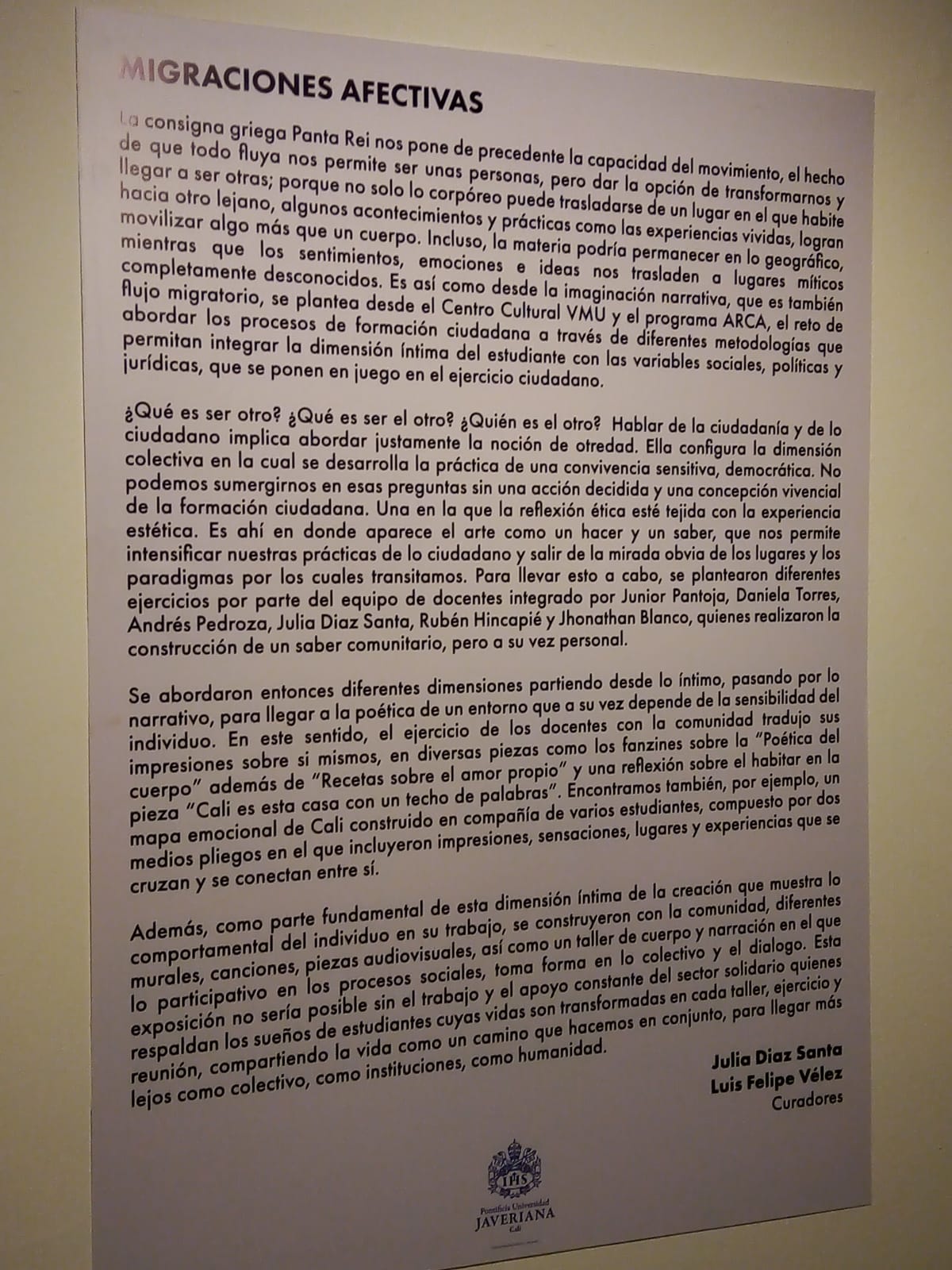 ¿Qué es ser otro? ¿Qué es ser el otro? ¿Quién es el otro? Hablar de la ciudadanía y de lo ciudadano implica abordar justamente la noción de otredad. Ella configura la dimensión colectiva en la cual se desarrolla el ejercicio y la práctica de una convivencia sensitiva, democrática. No podemos sumergirnos en esas preguntas sin una acción decidida y una concepción vivencial de la formación ciudadana. Una en la que la reflexión ética esté tejida con la experiencia estética. Es ahí en donde aparece el arte como práctica y saber, que nos permite intensificar nuestras experiencias de lo ciudadano y salir de la mirada obvia de los lugares y los paradigmas por los cuales transitamos. Para llevar esto a cabo, se plantearon diferentes ejercicios por parte del equipo de docentes integrado por Junior Pantoja, Daniela Torres, Andrés Pedroza, Julia Diaz Santa, Rubén Hincapié y Jhonathan Blanco, quienes realizaron la construcción de un saber comunitario, pero a su vez personal.