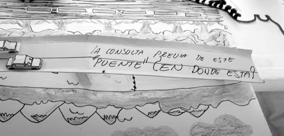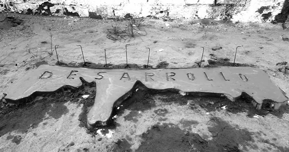 La obra “Desarrollo” de Nelson Fory, es un video de 10 minutos y medio grabado en blanco y negro, que muestra a la comunidad de La Boquilla, en Cartagena, teniendo una especie de reunión en la que, entre risas y chismorreo, arman una maqueta de su comunidad rodeando un puente vehicular en construcción. El vídeo continúa mostrando el proceso de hechura de la maqueta, hasta que hace un close up del puente terminado, con las siguientes palabras escritas en su pavimento: “la consulta previa de este puente ¿en donde esta?”, antes de que la cámara gire para mostrarnos como colocan una ultima casa (aparentemente de guadua o madera) en la maqueta. Ahora el vídeo salta a una denuncia pública en la que los habitantes del corregimiento de La Boquilla, muestran la construcción del puente en la vida real; una voz masculina afirma que la construcción está vulnerando los derechos de los pescadores, muestra el puente y nos invita a escuchar el golpe del martillo. Estridente y molesto, el martillo es el primer sonido que acompaña a la obra hasta este momento en específico.
