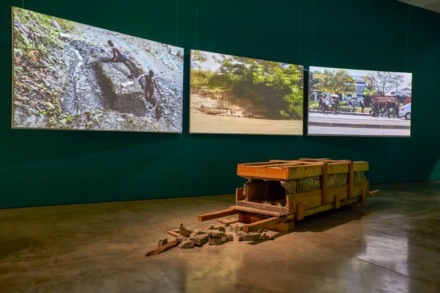 La primera es un sarcófago o socavón, elaborado por el propio artista, en un espacio similar a una mina. Este elemento podría considerarse un ready-made, pues ya existe y se usaba en los rituales funerarios de Santamaria, Timbiquí, lugar de donde es oriundo Eblin Grueso. El sarcófago es el dispositivo principal, el cual fue usado en la segunda pieza, un performance (ahora video performance) que se proyecta en tres canales en el que se ve una especie de simulación de un ritual funerario tradicional de Santamaria y muchas otras culturas negras en Colombia. El ritual consiste en una procesión en donde hay cantos guiados por la cantora, en los que regularmente se ven reunidos todos los allegados al difunto; en este performance, Eblin estuvo dentro del sarcófago/socavón “jugando al muerto” como él lo dice. Al llegar al lugar de destino, su hermano abre el sarcófago con un pico y sale, vivo, recita un poema con su tía (la guardiana de historias) y luego todos bailan juntos con música en vivo (marimba e instrumentos típicos de Santamaria y otras comunidades negras).