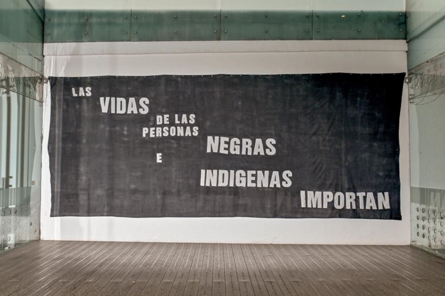 En esta obra podemos ver una gran tela negra con la frase “las vidas de las personas negras e indígenas importan”. Esta frase también se plantea en forma de pregunta debido que la obra (el objeto matérico) fue realizada durante el paro de 2020, en donde fueron apagadas cientos de vidas de jovenes de barrios bajos y resistencias indígenas que se sumaron al paro, las vidas obviamente, fueron principalmente de personas negras e indígenas.