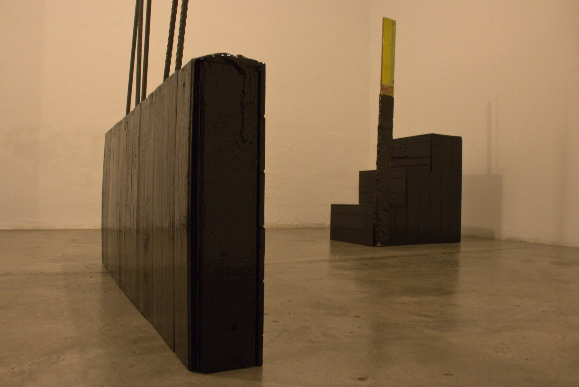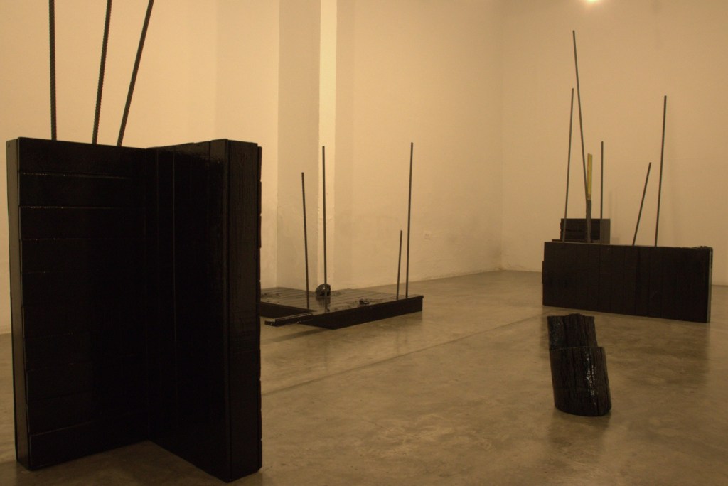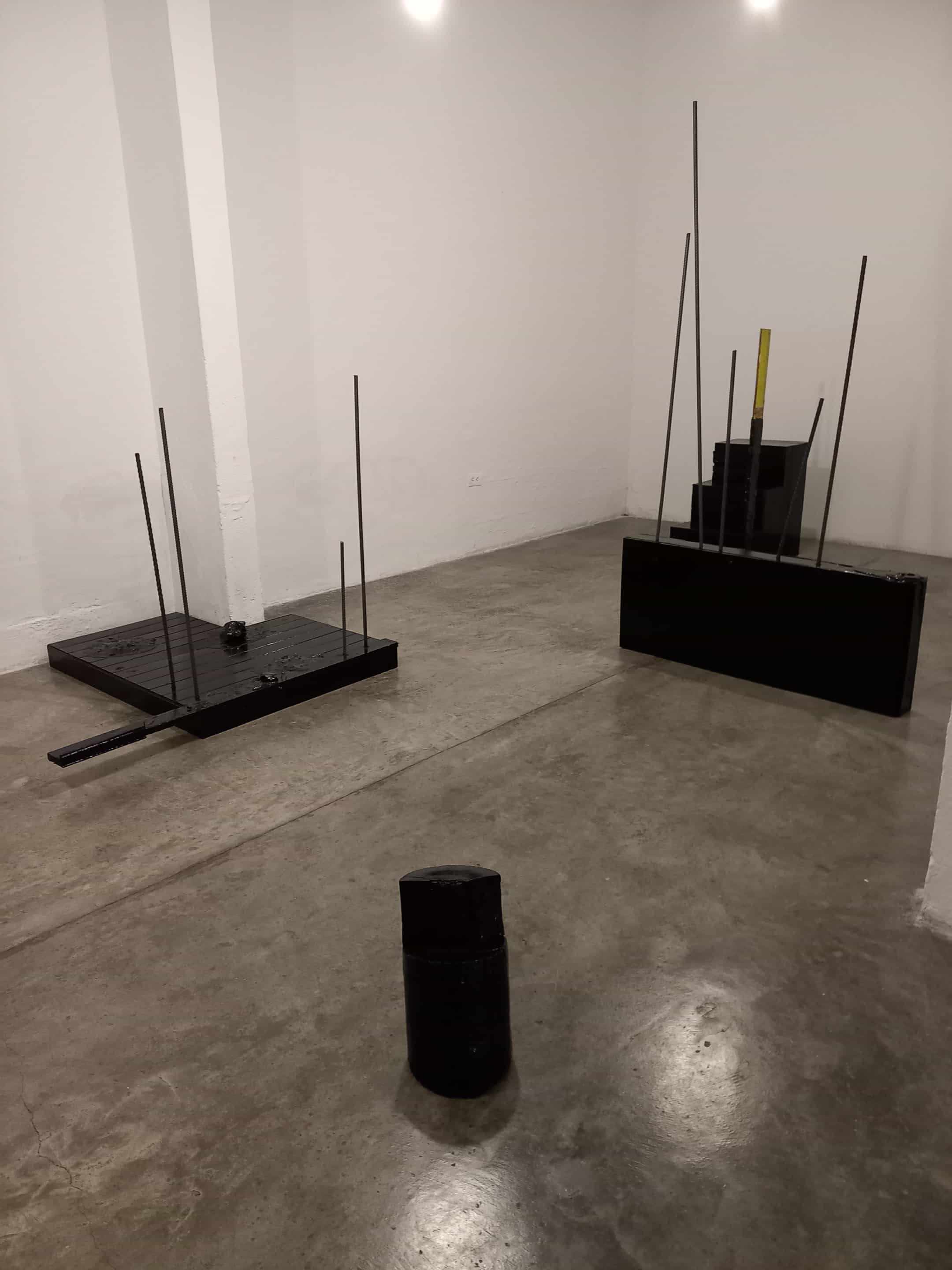 Cinco piezas de madera y hierro negras recubiertas de alquitrán se derriten como ruinas de un proyecto inconcluso. En esta obra, Henry Salazar retoma el Plan Piloto de Tumaco (1947-1949), diseñado por los discípulos de Le Corbusier, Sert y Wiener, que pretendía llevar la modernidad lecorbusiana al Pacífico tras el gran incendio, pero esa ciudad nunca llegó a existir.