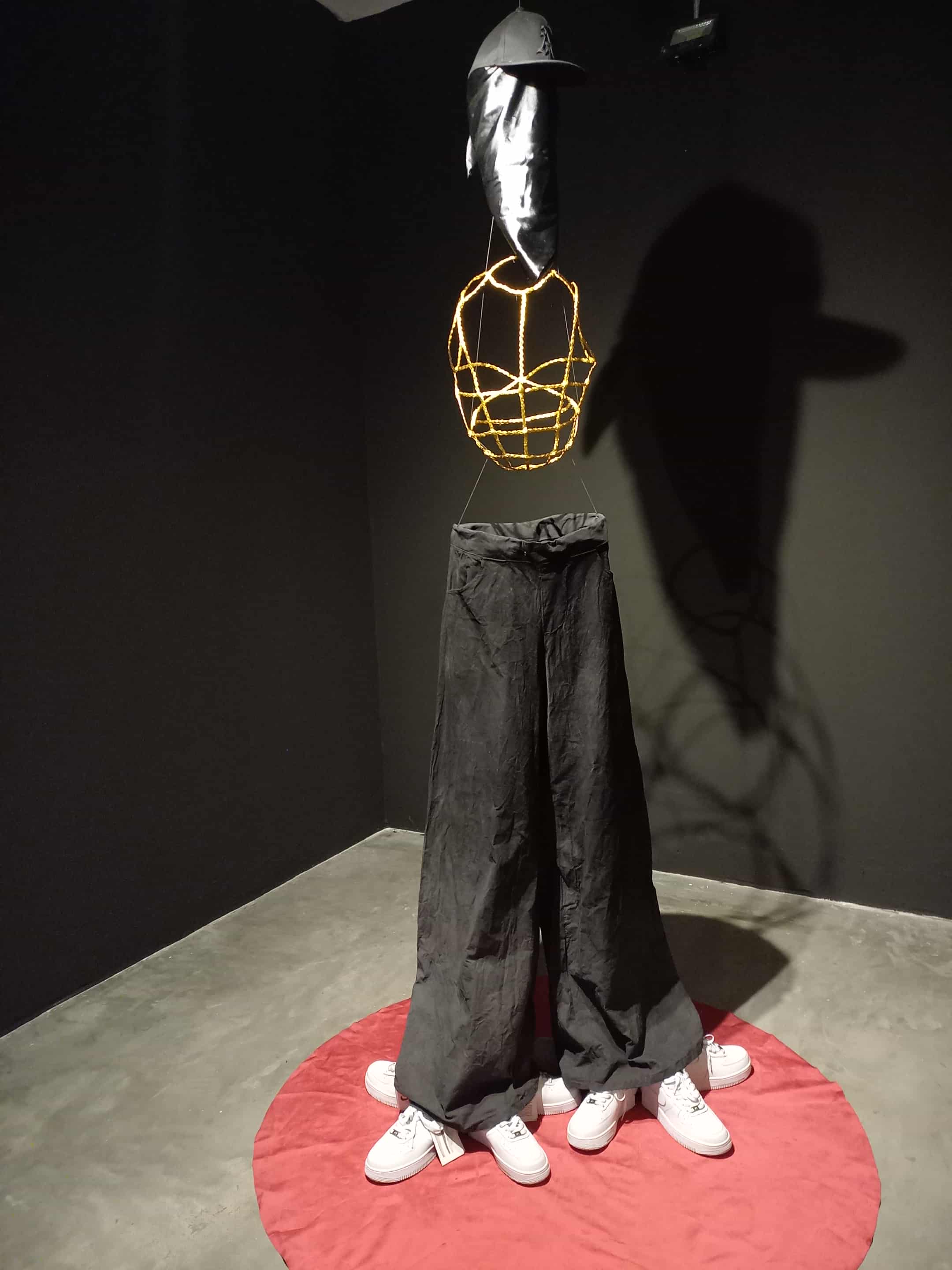 En Ancestral Gangsta, Romario Paz crea una escultura que evoca la fuerza simbólica del vestir en la cultura hip hop. Diez réplicas de zapatillas NAFO, un pantalón ancho, una pañoleta y una gorra conforman un cuerpo invisible que no se posa en un maniquí, sino en una estructura ligera de alambre. La ausencia de rostro permite que cualquier persona negra pueda reconocerse en esta figura, que se erige como ancestro, deidad y memoria viva.
