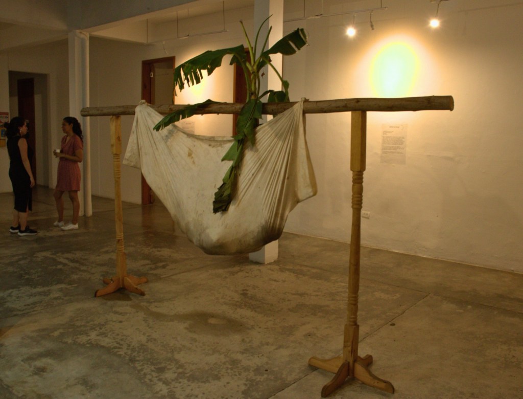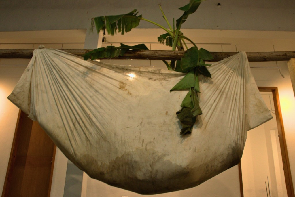 El aire se torna pesado. Una sábana sucia —camilla, ataúd, sostén— aparece como soporte de un cuerpo que en realidad no se encuentra; en su lugar, una mata de plátano con bidones de agua. ¿Es esta solo una imagen del quehacer cotidiano en Santa María de Timbiquí, donde nació el artista, o el destino forzado de quienes defienden la tierra: líderes sociales, ambientalistas y víctimas históricas cuyos cuerpos permanecen ausentes pero reconocibles en la memoria?