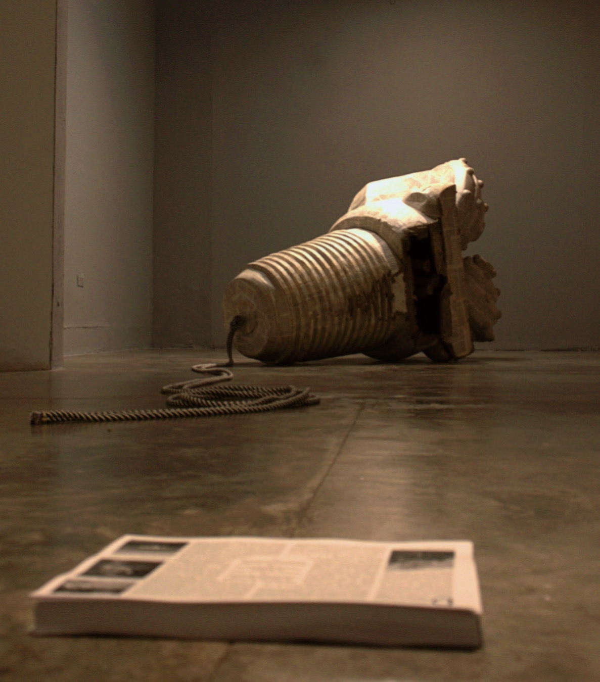 En Incidentes de un viaje al borde del río, Mónica Restrepo construye una broca tricónica en papel de libros de códigos mineros colombianos; que, arrastrada por una operaria, recorrió la ribera del Magdalena hasta Barranquilla. Lejos de quedar fijada en ese primer recorrido, la broca sigue siendo arrastrada por la artista en distintos trayectos urbanos, hasta llegar a este lugar. En su deriva por calles y paisajes, se carga de significados colectivos y memorias locales, interpelando la historia industrial y sus violencias, y desatando especulaciones artísticas, culturales, laborales y administrativas.