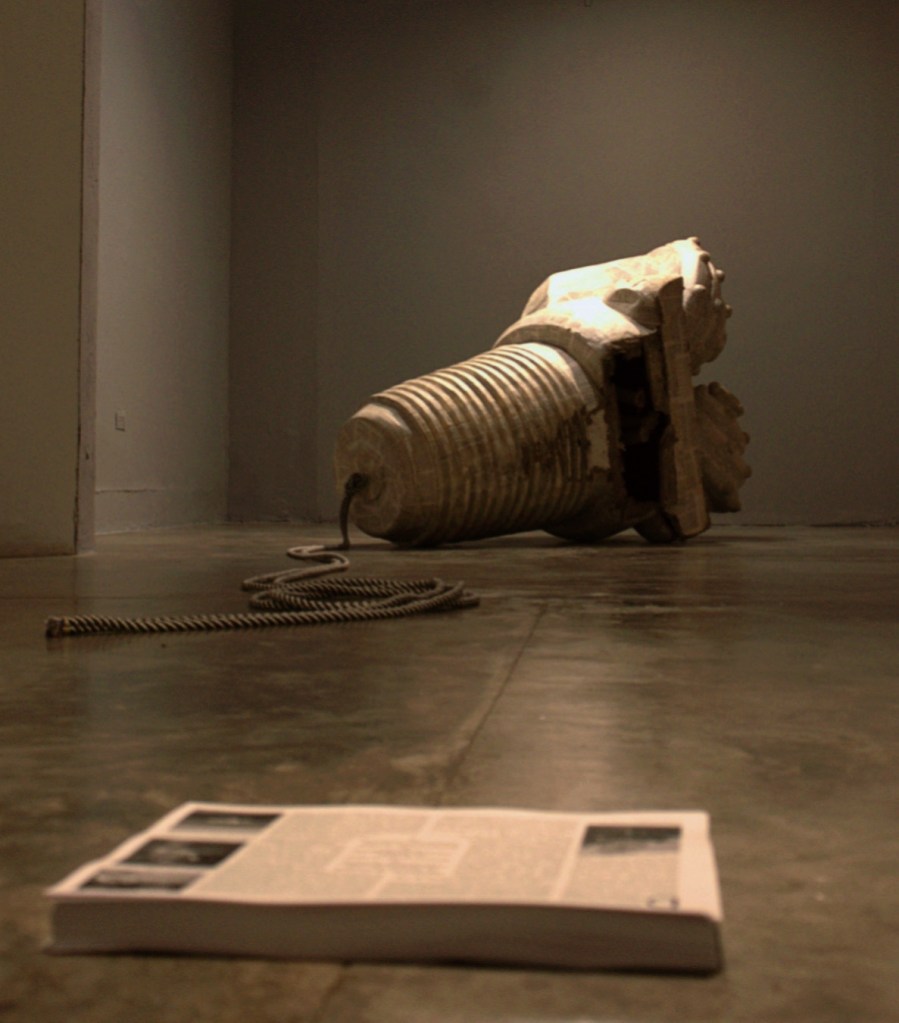 La broca aparece aquí transfigurada en un objeto híbrido: reliquia arqueológica, fósil industrial y ficción especulativa, que se activa por un relato sonoro que emerge de la pieza. La escultura, frágil y monumental a la vez, encarna la tensión entre la permanencia y la inevitable erosión de los materiales, evocando las huellas del extractivismo en el territorio.