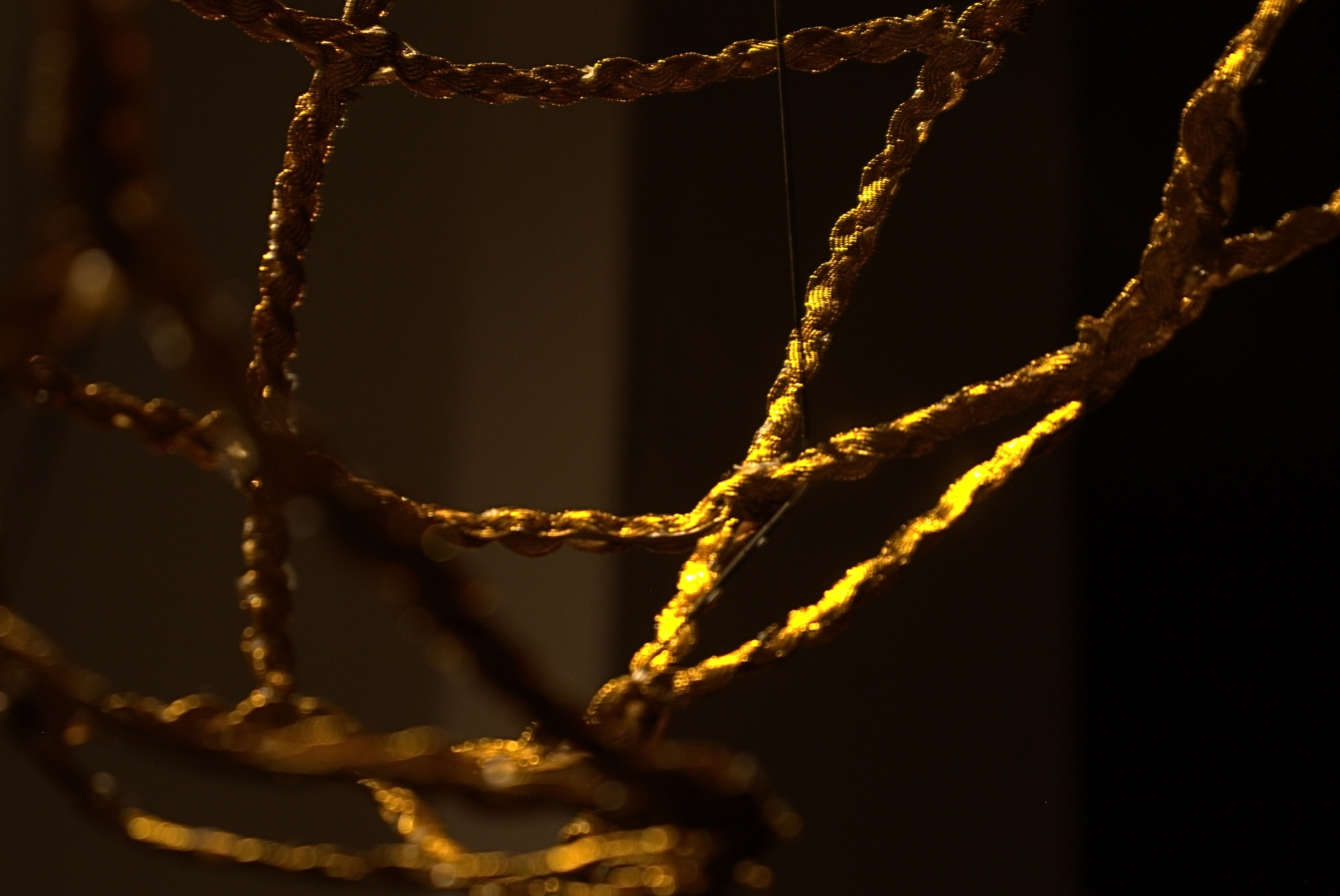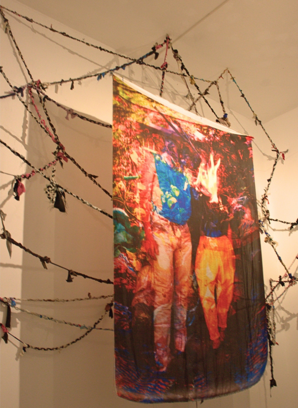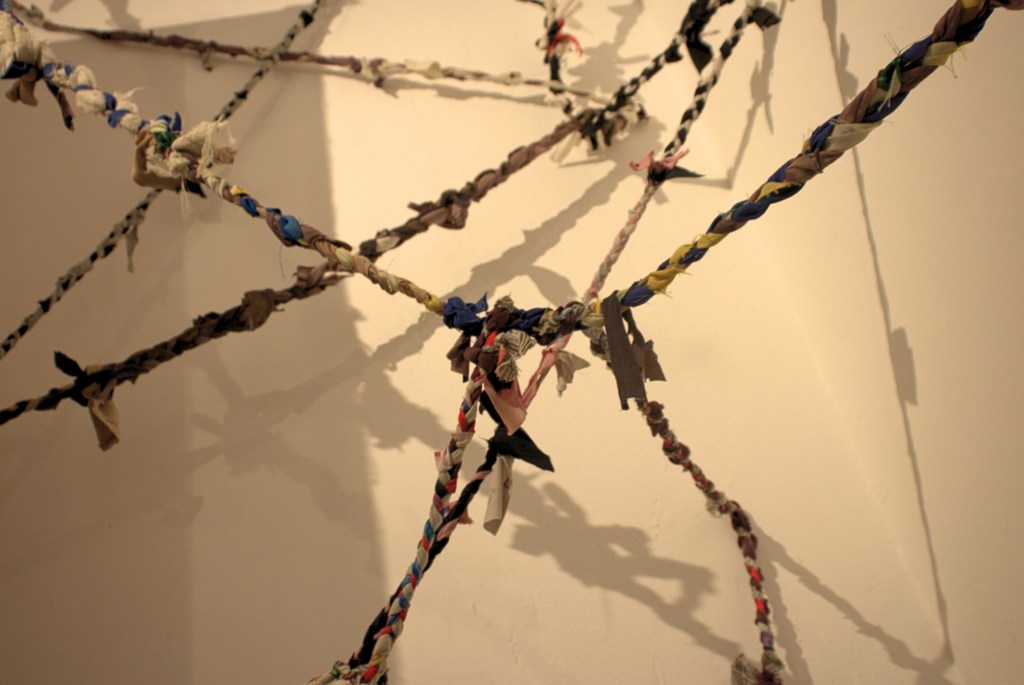 El montaje se acompaña de un tejido elaborado con prendas de su familia, al que Muñoz llama “tejido familiar afectivo”. Este entrelazado recoge fragmentos de la existencia de su madre, de la suya propia y de sus seres cercanos, reconociendo también su herencia indígena como raíz y sostén.