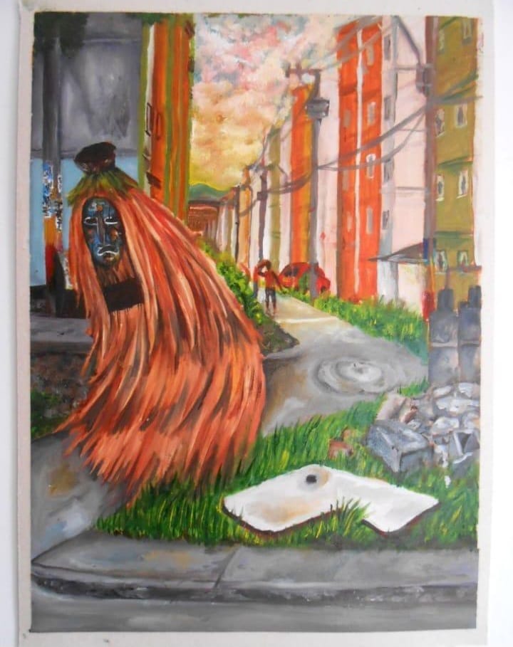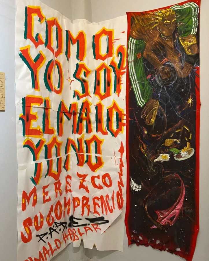 Esa ausencia de boca no es una omisión ingenua. Es una declaración: en el imaginario dominante, este cuerpo no tiene derecho a narrarse a sí mismo. Su imagen ya ha sido hablada por otros, desde el prejuicio, desde el miedo, desde el estigma. La pintura pone en evidencia cómo se consolidan arquetipos como el “vago” o el “ladrón”, y cómo frases como “lo mataron por…” operan como justificación de violencias sistemáticas. Esa violencia no es solo física, también es simbólica, pues niega la posibilidad de agencia, de deseo, de belleza.